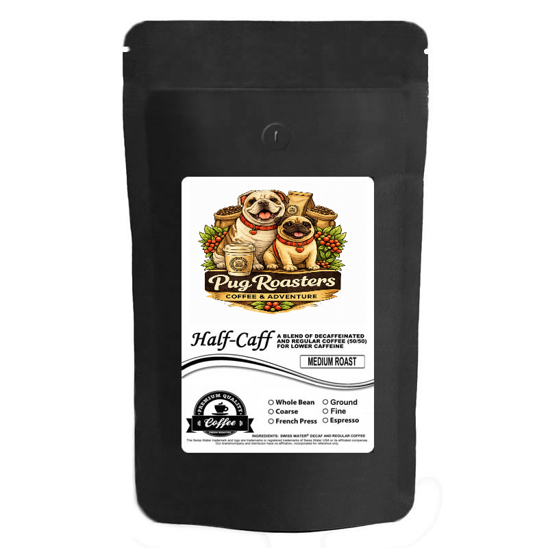Half-Caff Low Caffeine Whole Bean Coffee 12 Oz. Half-caff coffee is a blend of regular coffee and decaf coffee that has about half the amount of caffeine. It is a great option for people who enjoy coffee but are looking to reduce their caffeine intake. The resulting coffee is a balanced blend that has a similar taste to regular coffee, but with less caffeine.